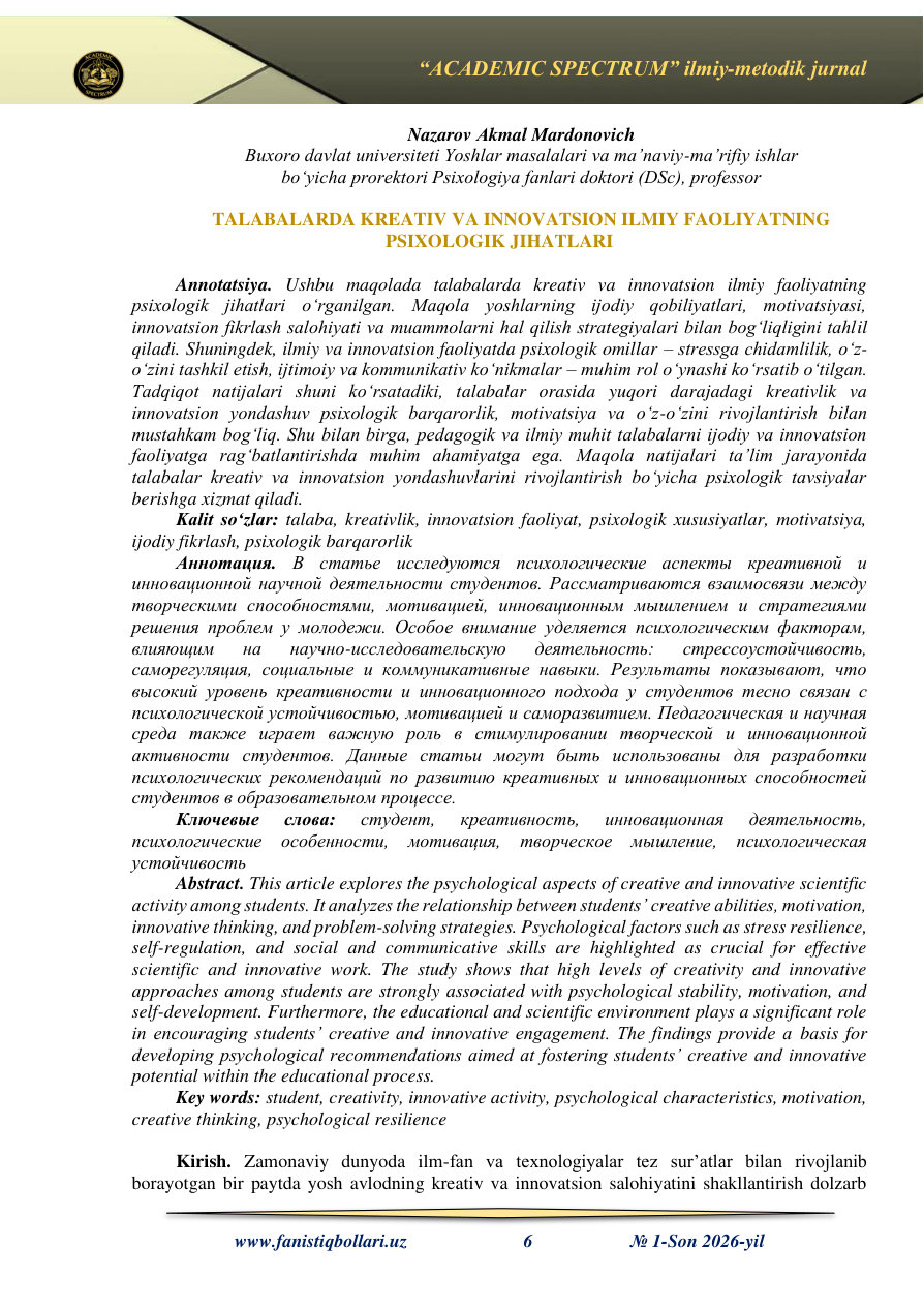 TALABALARDA KREATIV VA INNOVATSION ILMIY FAOLIYATNING PSIXOLOGIK JIHATLARI