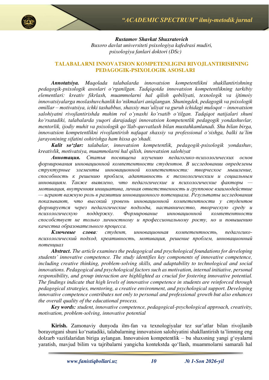TALABALARNI INNOVATSION KOMPETENLIGINI RIVOJLANTIRISHNING PEDAGOGIK-PSIXOLOGIK ASOSLARI