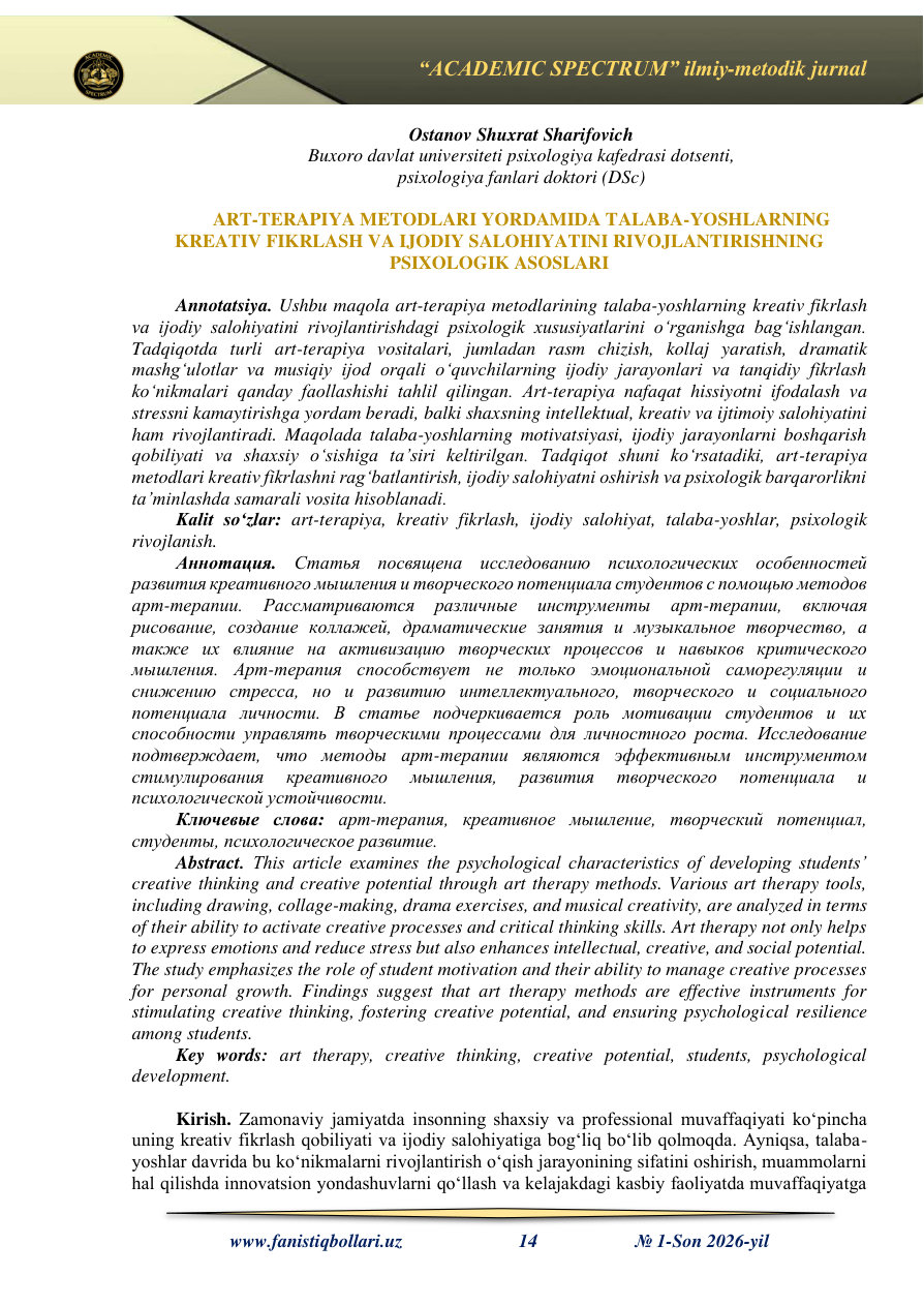 ART-TERAPIYA METODLARI YORDAMIDA TALABA-YOSHLARNING KREATIV FIKRLASH VA IJODIY SALOHIYATINI RIVOJLANTIRISHNING PSIXOLOGIK ASOSLARI