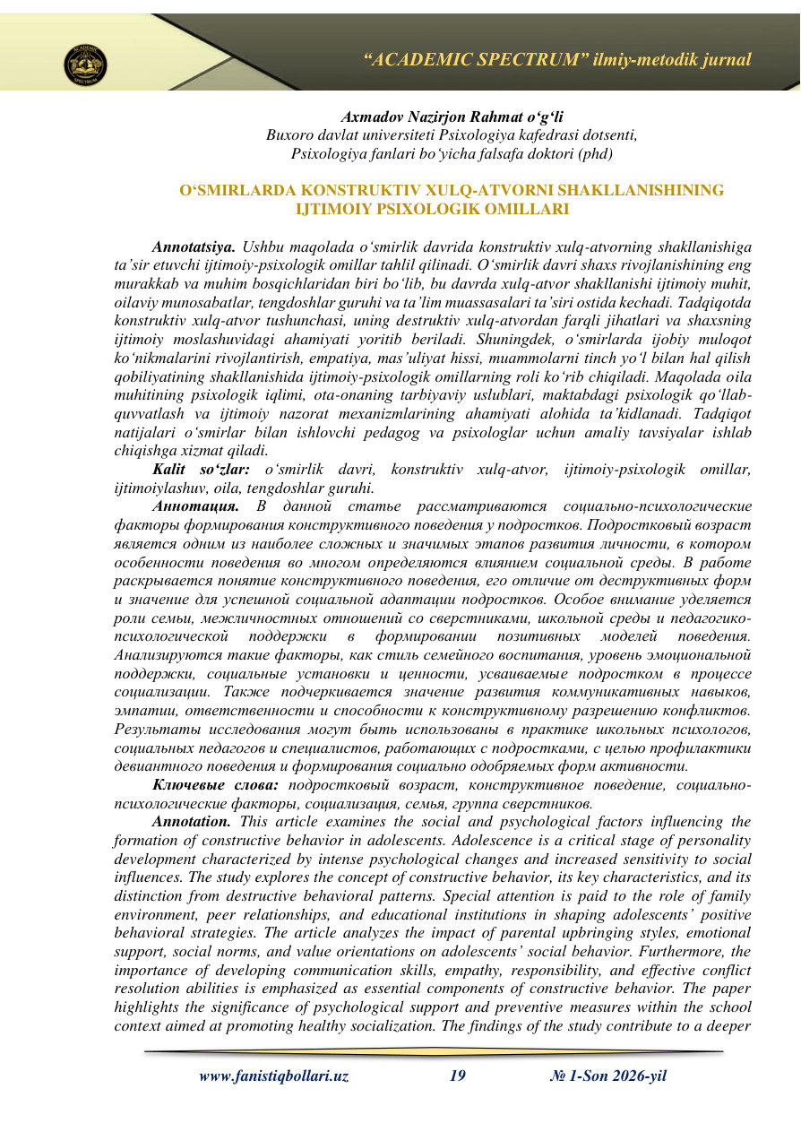 O‘SMIRLARDA KONSTRUKTIV XULQ-ATVORNI SHAKLLANISHINING IJTIMOIY PSIXOLOGIK OMILLARI