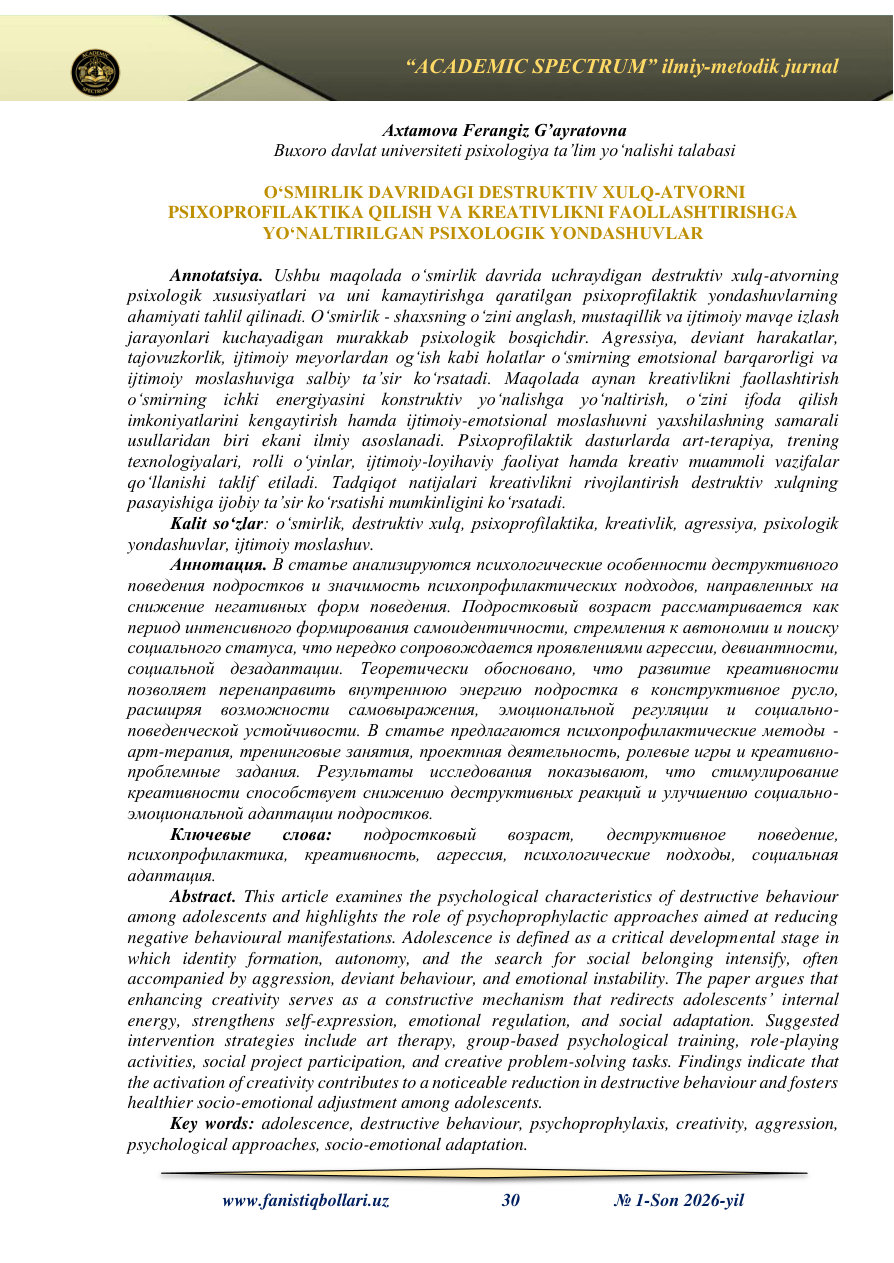 O‘SMIRLIK DAVRIDAGI DESTRUKTIV XULQ-ATVORNI PSIXOPROFILAKTIKA QILISH VA KREATIVLIKNI FAOLLASHTIRISHGA YO‘NALTIRILGAN PSIXOLOGIK YONDASHUVLAR