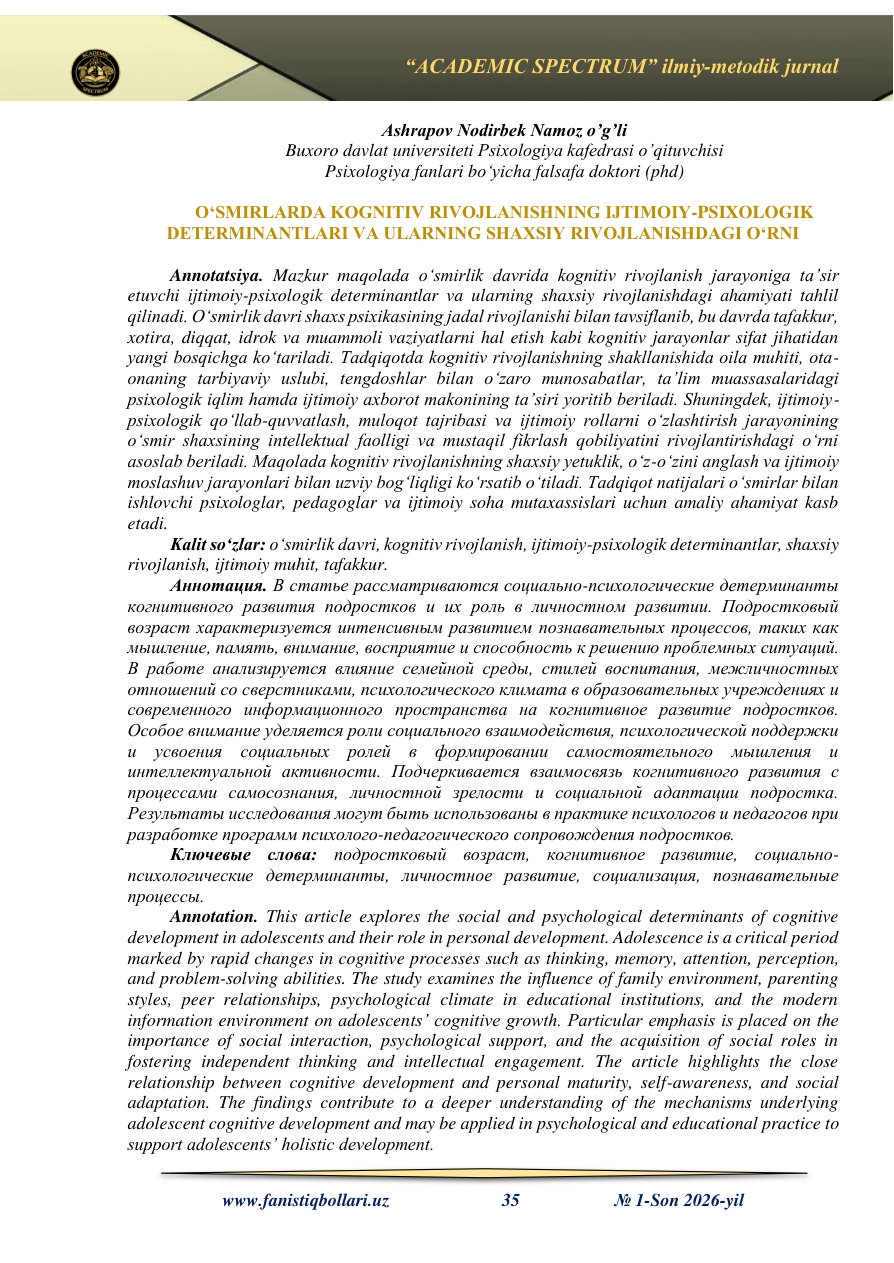 O‘SMIRLARDA KOGNITIV RIVOJLANISHNING IJTIMOIY-PSIXOLOGIK DETERMINANTLARI VA ULARNING SHAXSIY RIVOJLANISHDAGI O‘RNI
