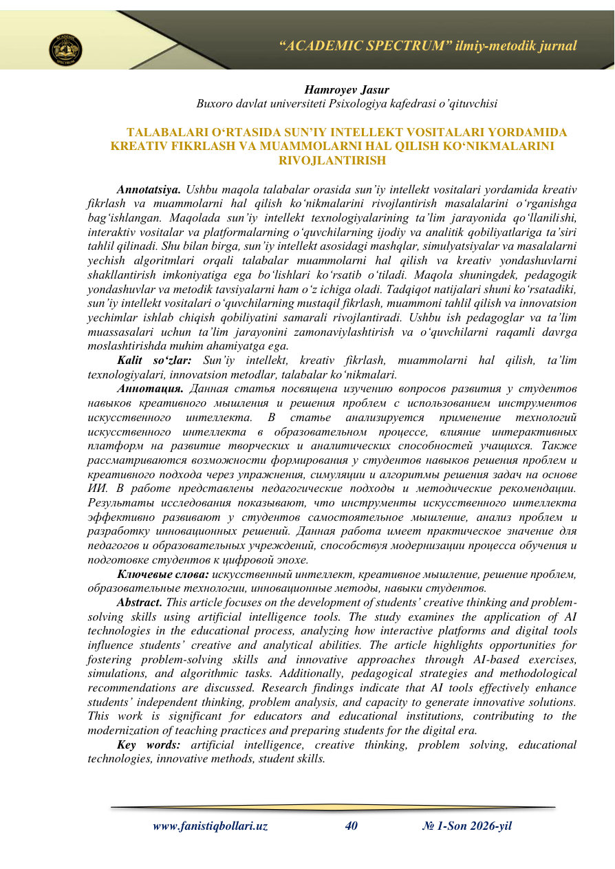 TALABALARI O‘RTASIDA SUN’IY INTELLEKT VOSITALARI YORDAMIDA KREATIV FIKRLASH VA MUAMMOLARNI HAL QILISH KO‘NIKMALARINI RIVOJLANTIRISH
