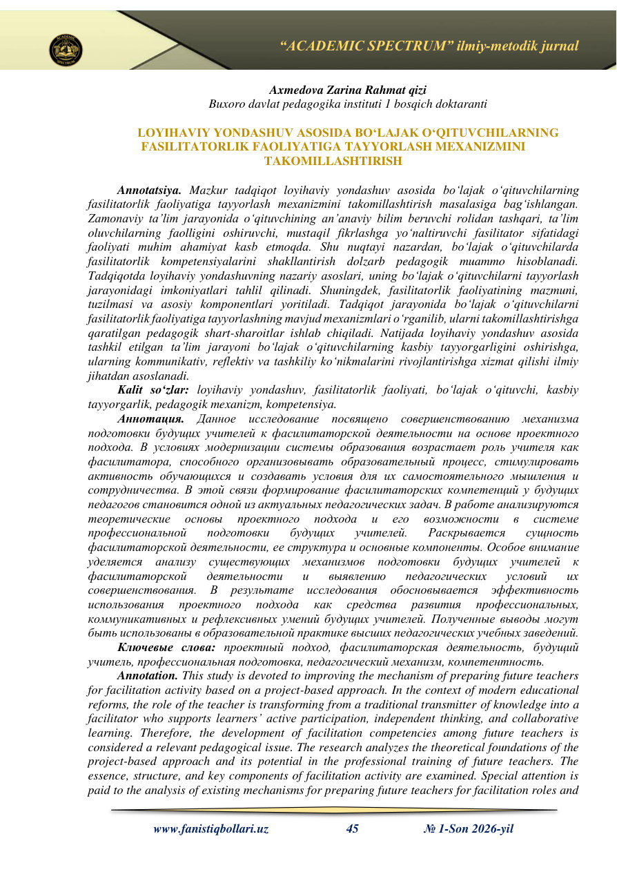 LOYIHAVIY YONDASHUV ASOSIDA BO‘LAJAK O‘QITUVCHILARNING FASILITATORLIK FAOLIYATIGA TAYYORLASH MEXANIZMINI TAKOMILLASHTIRISH
